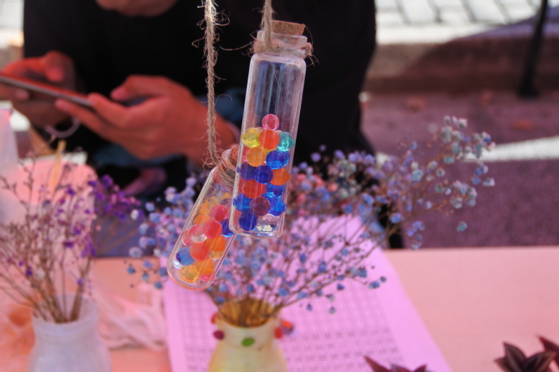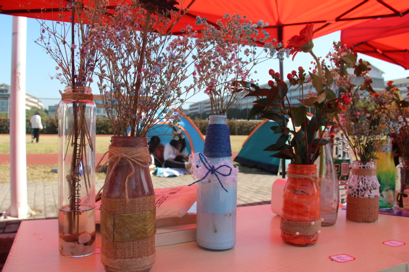 暖·情怀展区有绿色协会的废物利用作品展,绿协的同学们集思广益,废弃的酸奶瓶子摇身一变,成为了五颜六色的艺术瓶,加上漂亮的满天星,感受到满满的少女心了。