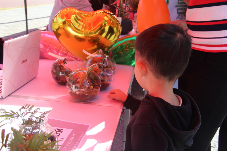 创·风景展区有现场插花展示,也有微景观展示,还有叶脉书签、压花作品以及多肉绿植植物的义卖,既赏心悦目,又有馥郁花香,让人流连忘返。现场萌萌哒的多肉让不少人驻足,而趣味十足的微景观更是让前来淘宝的小朋友爱不释手。