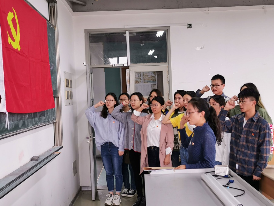 随后全体党员佩戴党徽,在党支部书记徐娜老师的带领下在党旗前宣誓,铿锵有力的声音也激发起大家的热心与激情。