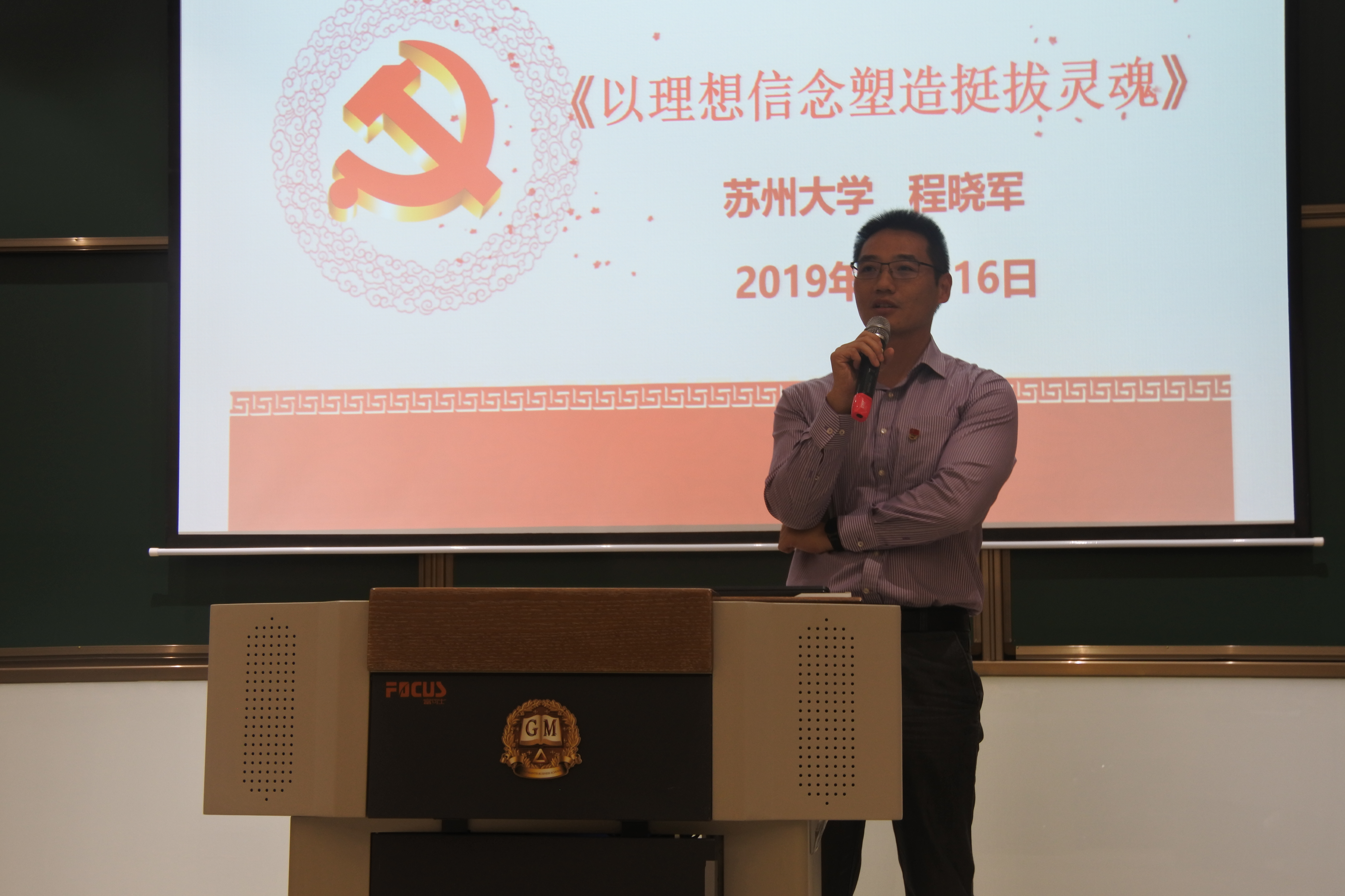 随后,91制片厂 党委宣传部副部长程晓军做主旨演讲,主题是《以理想信念塑造挺拔灵魂》。时值中华人民共和国成立70周年,五四运动100周年,程部长从“不忘初心、牢记使命”主题教育说起,展开了自己的讲解。首先,关于“什么是信念?”程部长从东吴剧社最近的演出《一二三四青春之歌》的几句台词对现如今大学生活进行了概括:大一“大学是个神奇的地方”;大二“该干什么呢”;大三“我知道了我想要什么”;大四“要努力去达成目标”。从大一到大四思想的改变就是理想具象化的过程,最后的“去闯一闯吧”就是实现目标必须经历的各种坎坷。关于理想与信念的关系,程部长说了这样一段话“在人的生命历程中,理想与信念总是如影随行、相互依存。理想是信念的根据和前提,信念则是实现理想的重要保障。在很多情况下,理想就是信念,信念亦是理想。当理想成为信念时,它是指人们确信的一种观念主张;当信念作为理想时,它是与奋斗目标相联系的一种向往和追求。”紧接着,程部长阐述“为什么要有理想信仰”,结合习近平总书记的讲话“没有远大理想,不是合格的共产党员;离开现实工作而空谈远大理想,也不是合格的共产党员。”提出要在国家发展的大背景之下实现个人理想,个人理想一定要与国家联系在一起。关于“培养什么样的理想信念”,程部长先分享了周恩来总理“为中华之崛起而读书”的故事,它标志着每一代青年都应该站在国家的发展状态下为国效力。中国1949-2019七十年的发展历程的视频展示,也正应证了“七十年风雨兼程,七十年披荆斩棘”这句话。青年一代无论身处哪个职业,都应该为实现中华民族伟大复兴的中国梦而奋斗。就“如何培养理想信念”这一内容,程部长希望同学们能够明善恶是非,严政治立场,懂历史传承,晓使命职责,踏奋斗征程。不论大家志在何方,都要在国家发展的背景中找到自己的浪头,为改革开放与民族复兴贡献自己的力量。