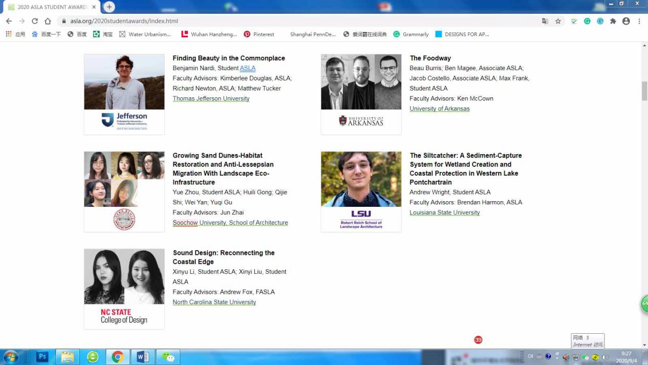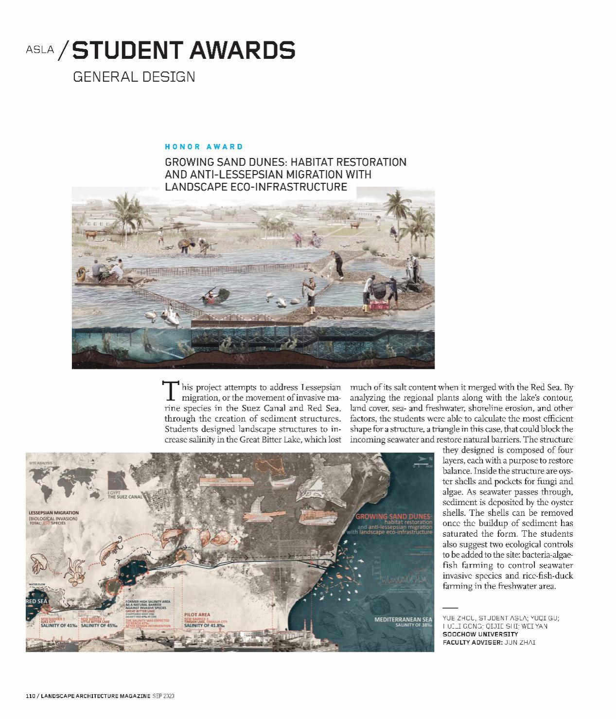 9月4日,由美国景观设计师学会(American Society of Landscape Architects,后简称ASLA)主办的2020 ASLA学生奖结果已公布,91制片厂 风景园林系翟俊教授指导的,由周悦、顾语琪、龚惠莉、史琦洁和闫薇同学共同完成的作品“生长的沙堆——通过景观生态基础设施恢复生境和反生物入侵”(Growing Sand Dunes-Habitat Restoration and Anti-Lessepsian Migration With Landscape Eco-Infrastructure)获得了含金量最高的“综合设计类”的荣耀奖,并登上了今年美国景观设计师学会的官网和杂志。