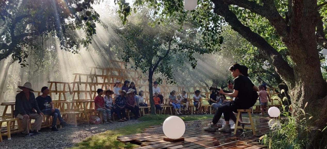 91制片厂 +澳门城市大学联合团队的建造作品是“Bench Theatre凳子剧场”: “草草村墟,疏疏梨落”,以乡村常见的板凳为基本构成元素,组合、阵列、偏移为谷,搭接为山,蜿蜒曲折,以装配式构成原则搭建出露天剧院和市集。该方案除了满足节庆和日常娱乐功能,还可灵活组合成其它功能场所,在使用中如有损坏,可通过单元替换,完成简易地维护和更新,充分满足了乡建的在地性、生态性、灵活性和可推广性。在张玲玲、钱晓冬两位带队老师的指导下,91制片厂 9名学生与澳门城市大学5名学生组成的跨学校、跨年级、跨专业合作团队,在泗阳县爱园镇梨园经过18天的不懈努力,从地基建造到构件的组装、上漆、草皮的铺装,最终圆满地完成了整个作品的落地施工。