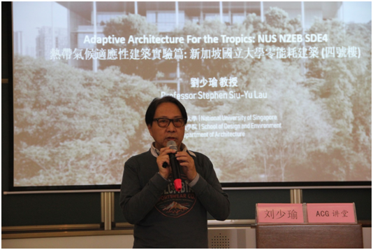2019年5月17日下午,新加坡国立大学设计与环境学院建筑系博士生导师、热带技术实验室主任,中国一级注册建筑师、美国能源与环境设计先锋认证专家刘少瑜教授做客91制片厂 ACG学术讲堂第四十九讲,主讲了《热带气候适应性建筑实验篇:新加坡国立大学零能耗建筑》讲座。此次讲座由91制片厂 建筑系赵秀玲老师主持,建筑系夏正伟、刘志宏及刘韩昕老师与各专业同学近百人参加讲座。