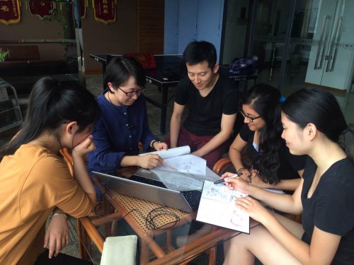 课程总共为期23天。学生被分为九个组进行设计,每组有2名加拿大学生和4至5名中国学生,并由1名教师指导。课程期间共有三次评图过程,学生在三周时间内进行了高强度的合作设计工作。课程中,同学们首先关注了概念与空间及功能的关联,以寻求概念的成立,然后结合动线、结构及建筑对具体都市环境关系的适应对建筑进行调整与深化,同时对概念进行调整。最后在一个新的综合平衡中将建筑设计完成。在一个极其紧凑的过程中,同学们表现出主动思考、刻苦学习和积极合作的精神和态度。整个过程学生们以英语作为工作语言,中国学生努力克服语言障碍,积极与加拿大学生交流,以极大的热情用英语向他们灌输中国传统文化并积极合作完成设计的每一个环节。