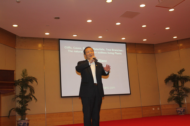 王仙民,世界立体绿化协会副主席兼秘书长、国际园林景观规划设计行业协会名誉会长、中国绿色建筑委员会立体绿化学组副组长兼秘书长。他作为本次讲座的主持人,在讲座开始前对主讲人Patrick Blanc博士的主要事迹进行了简单介绍。Patrick Blanc博士,植物学家、法国国家科学研究中心主任、世界屋顶绿化协会副主席;在法国国家科学研究中心从事亚热带森林植物的研究,主要研究植物对极端恶劣环境的适应性,他从事墙体绿化研究四十年,作品遍布五大洲,被业界誉为:世界绿墙之父;他曾获得多种奖项,包括1993年法国科学学会植物学奖、1999年科研部创新大赛奖、以及2002年创造天才峰会等奖项。王仙民老师以一句“他巧妙的把多种适生植物搭配在一起,墙体绿化犹如法国卢浮宫中一幅幅多姿多彩的油画”,表达对Patrick Blanc博士的敬佩之情。
