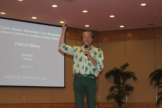 在现场人员还沉浸在对大自然神奇力量的无限感慨中时,Patrick Blanc博士的讲座接近尾声,主持人王仙民老师再一次对Blanc表达敬意及感谢,同时开始讲述河北及北京地区严重的雾霾,分析雾霾产生的根源,进而探讨治理雾霾的方法,从而引入立体绿化能有效治理雾霾的观点。很多人对立体绿化还有一些疑问,在演讲中他针对设计、施工、概念等方面的问题,引用国内外的案例一一解答。另外,他还介绍了外国推进立体绿化的政策和制度。讲座在无比热烈的掌声中落下帷幕。
