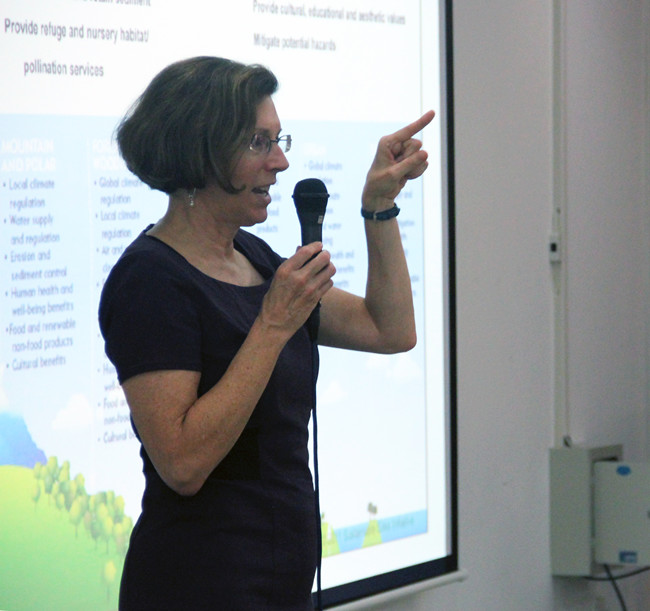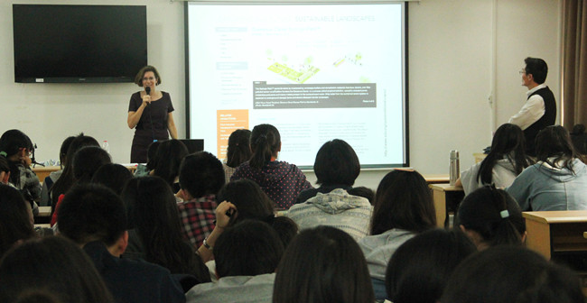 本次讲座Kelleann Foster副教授首先图文并茂地介绍了宾夕法尼亚州立大学的校园、教学环境以及远程网络地理设计新课程,充分调动了学生们的兴趣和积极性。接着,讲述了有关景观设计与绿色建筑的一系列知识,如何设计绿色景观、地理设计与环境设计相统一、GIS技术与景观设计结合等。然后,通过费城雨水管理实践、Sidwell Friends School的绿色建筑等实际案例,生动地解读了可持续场地设计的评估体系、措施及重要性,强调保护环境、可持续发展、注重用地方式、符合环保节约的理念,并且就《成为一名景观设计师》一书中的核心内容作了详细的介绍,向学生们灌输了一些先进的设计理念和方法。讲座最后,Kelleann Foster副教授与学生们进行了积极有效的现场问题互动。