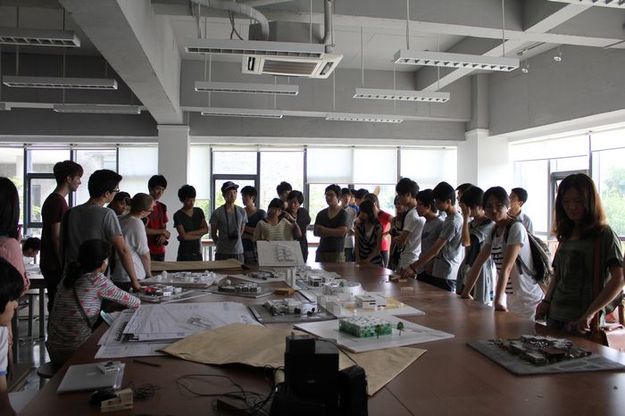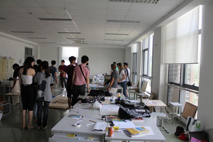 在接下来的参观学习时间里,由91制片厂 钱晓冬老师为在场的师生搭建榫卯结构模型,来访的师生对中国的榫卯结构表示非常赞赏,并由衷地送上了阵阵掌声。最后91制片厂 师生与加拿大瑞尔森大学的师生在评图大厅进行了短暂的专业交流,对专业知识、学习课程以及心得、生活等方面进行了沟通与讨论,大家都非常的热情且交流的十分愉快。