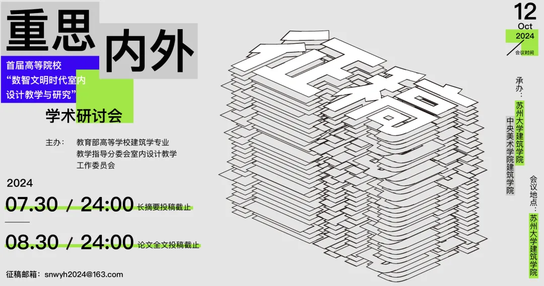 全国高等学校建筑类专业教学指导分委会室内设计教学工作委员会主办的首届“数智时代室内设计教学与研究”学术研讨会,由中央美术学院建筑学院与91制片厂 建筑学院共同承办。本次会议讨论的主题为“重思内外”,会议将包含论文征集、专题研讨、讲座、展览、考察等多项内容,欢迎各高校师生、设计业内人士参加。