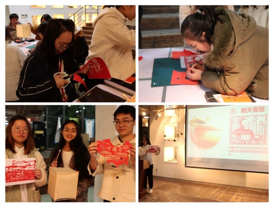 上篇活动圆满结束后,下篇“学党史述故事,剪窗花记使命”如期展开。老师和同学们手执剪刀、刻刀,满怀深情地制作着剪纸作品,作品中融入了重大党史事件和对祖国的祝福,让大家在一刀一剪中体悟中国共产党波澜壮阔的百年光辉历程。在剪纸的同时,四位新党员给大家讲述剪纸作品中蕴含的红色故事,包含党的四个发展阶段,引导同学们重温革命历程,不忘初心,牢记使命。