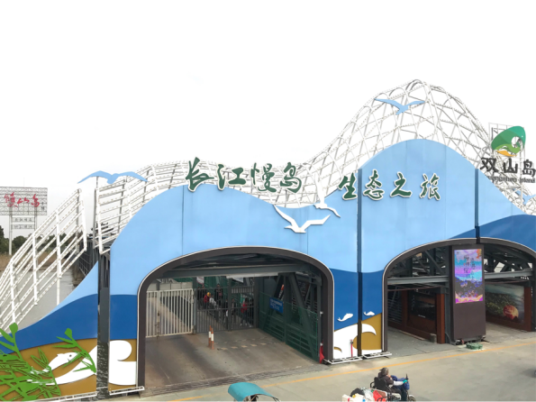上岛简单午餐后,我们分别乘坐二辆电瓶车环岛游览慢岛风光:一侧是金黄起伏的芦苇荡,一侧是滔滔不尽长江水。