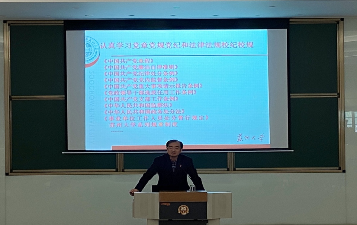 学校纪委副书记黄志斌先从“什么是纪律和规矩”切入,带领大家重温党章,用党章唤醒初心,“把纪律挺在前面,就要学好党章,真正把党章内化于心,外化于行。如果不注重学习,对党章党规党纪一知半解,很容易触底线、踩红线。”