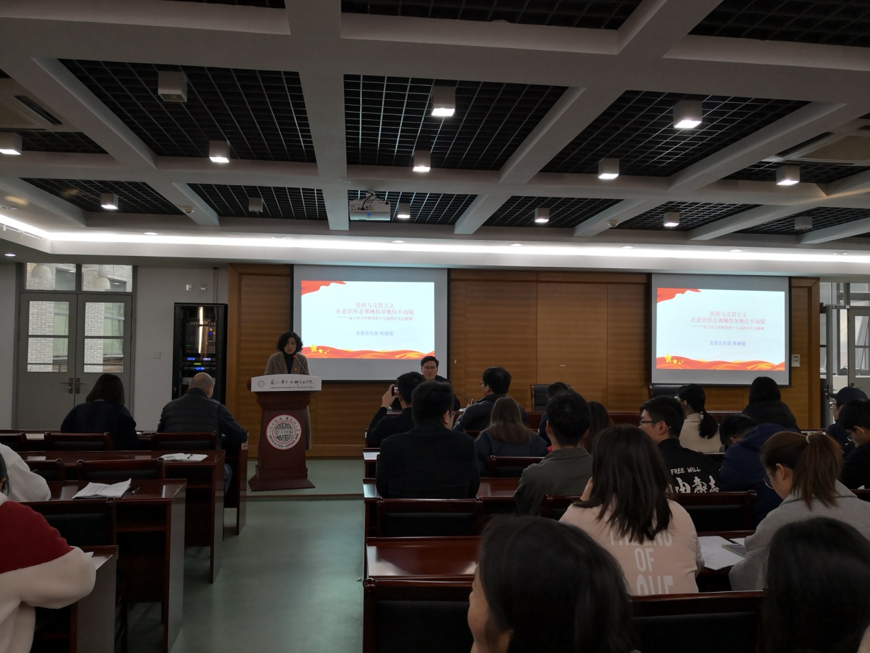 陈部长以《坚持马克思主义在意识形态领域指导地位不动摇——深入学习贯彻党的十九届四中全会精神》为题,紧扣党的十九届四中全会精神,分三个方面进行阐述,一是十九届四中全会的基本情况,二是如何坚持马克思主义在意识形态领域指导地位不动摇,三是如何贯彻落实十九届四中全会精神。
