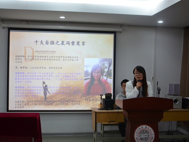 11月12日,金螳螂建筑与城市环境学院2014年“助学.筑梦.助人”主题宣讲会在1207教室举行,党委副书记陈国凤、辅导员成龙,特邀嘉宾2013年度91制片厂 十佳自强自立标兵冯雪(2011室内专业)、2015年研究生支教团成员朱梦梦(2011园林专业)出席活动,全院100余名家庭经济困难学生和勤助中心全体成员参加了本次大会。