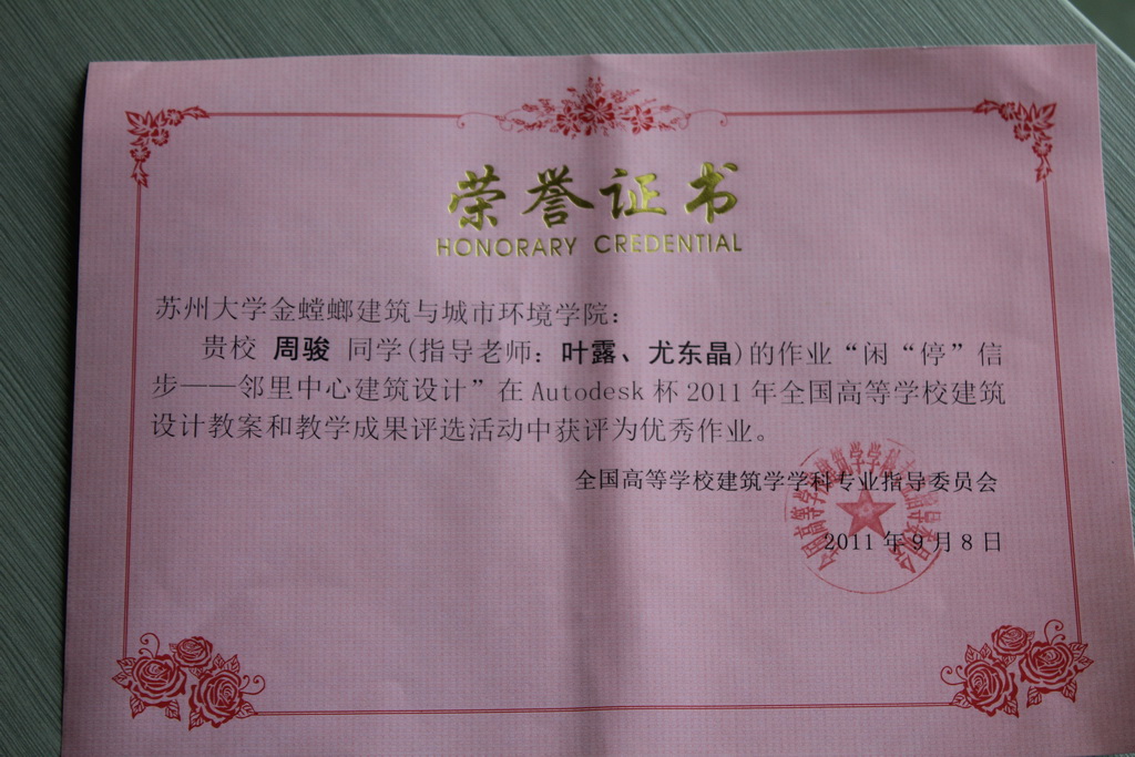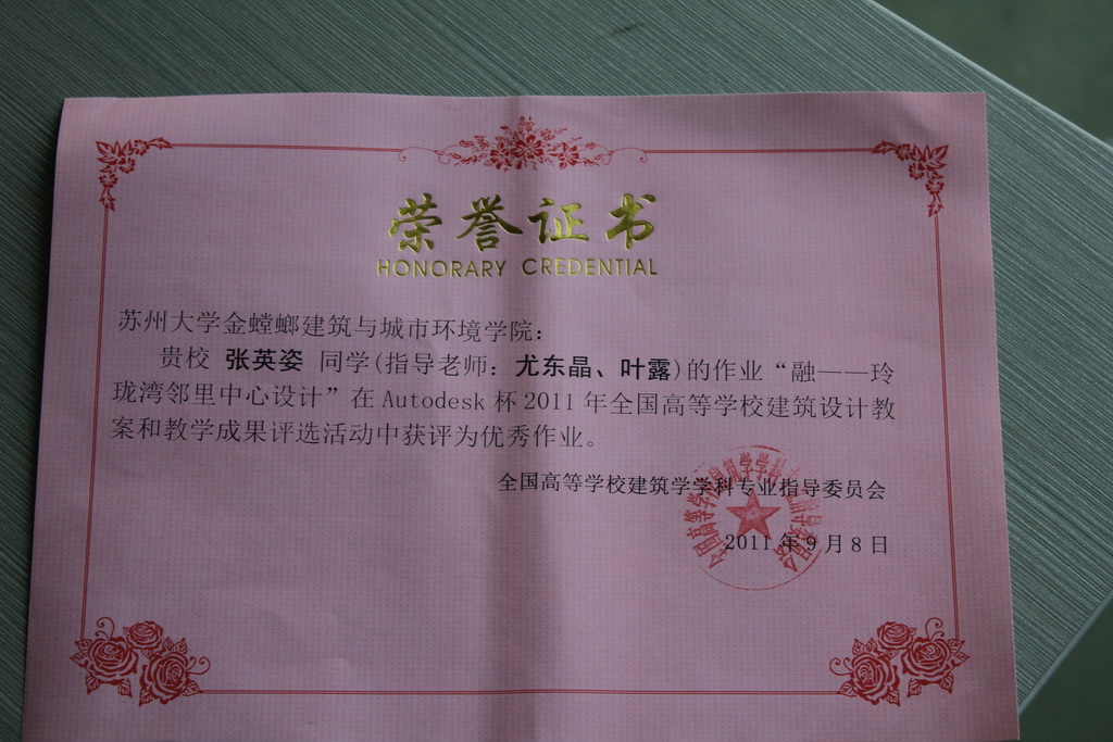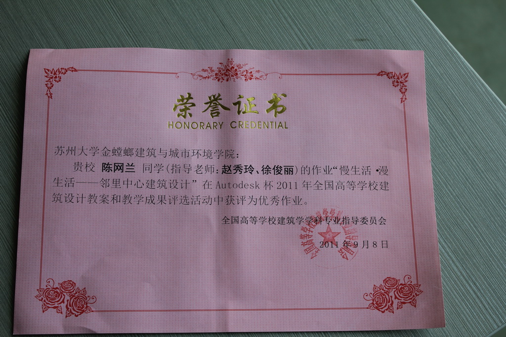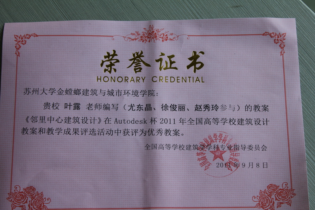 经过专指委的评选三个参赛教案中叶露老师的《邻里中心设计》获评优秀教案,陈网兰、张英姿、周骏三名同学的设计作业获评优秀作业。通过参加本次活动并获奖,大大扩大了91制片厂 在全国设计类院系中的影响,也充分发挥了同学们的学习热情和创造性,增强了与兄弟院校的交流。