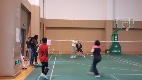比赛分为女单、男单和“师生”混合双打三个项目,赛前以抽签的方式将所有参赛选手分组,下午一点整,羽毛球赛正式打响,师生们轻装上阵,热情高涨,打得积极主动,比赛精彩激烈。在场上的选手们挥洒这汗水的同时,赛场边的老师和同学自愿当起了啦啦队,为选手们加油喝彩,场上场下打成一片。在男单女单赛结束后,由郭明友老师和女子单打第一名戴雪茹同学组成的混双队伍对战颜彤老师和男子单打第一名左传雨同学的混双队伍,两组选手的实力旗鼓相当,双方都使出浑身解数,配合默契有度,双方比分交替上升,最后郭明友老师的队伍以微弱优势险胜颜彤老师组,两组的精彩对战将现场气氛推向高潮。