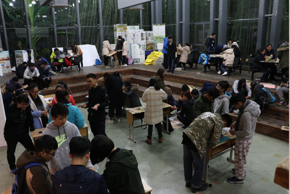 很快,活动开始了,在主持人介绍完材料背景相关流程后,活动的第一阶段小组讨论构思持续了十分钟,之后小组间协商互换材料。一切就绪后,每个组都开始了全身心制作。活动还设置了熄灯环节,使同学们更好的将光与影融合模型。