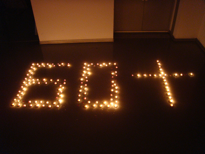 入口处共同用蜡烛摆放出地球一小时的标志,表达自己对地球与未来的美好祝愿。