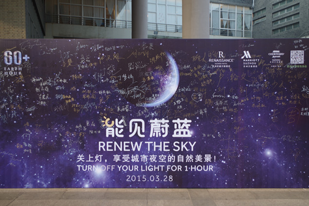 “地球一小时”是世界自然基金会在2007年发出的一项倡议:呼吁个人、社区、企业和政府在每年3月23日熄灯1小时,以此来激发人们对保护地球的责任感。今年,为了呼应当前苏州最急迫、最受关注的环境议题——雾霾,传递环保正能量,91制片厂 绿色协会携手苏州万豪酒店联盟开展“能见蔚蓝”地球一小时系列活动,通过地铁快闪,环保骑行,校园不插电演唱会,呼吁市民和学生“关爱地球,解放苍穹”。