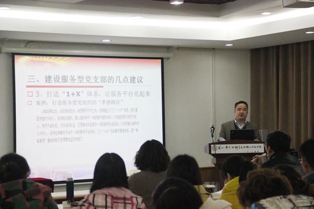 党委书记查佐明围绕“服务型党组织怎么建“这一话题,从理顺教师和学生党支部的主要职责出发,分析服务型党支部建设的意义、要求、任务、方法和组织领导,对服务型党支部建设提出了几点建议:加强调查研究,让服务需求实起来;提升能力素质,让服务队伍强起来;打造“1+X”体系,让服务平台亮起来;追求群众满意,让服务质量优起来;做好群众工作,让服务方式新起来。