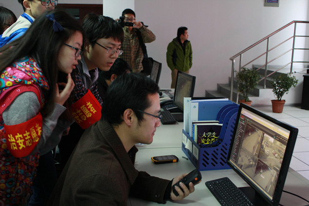 最后,同学们还参观了保卫处指挥中心,工作人员告诉他们,该监控室观察着学校5个校区的几个事故多发地点。就在这时,大家伙正好“看到”一个可疑男子偷车和保安人员抓捕他的全过程,这让同学们看呆了。工作人员告诉他们,这在他们日常生活中偶有发生,并提醒同学们注意在适当的地方停放并锁好车辆,以免造成财产损失。