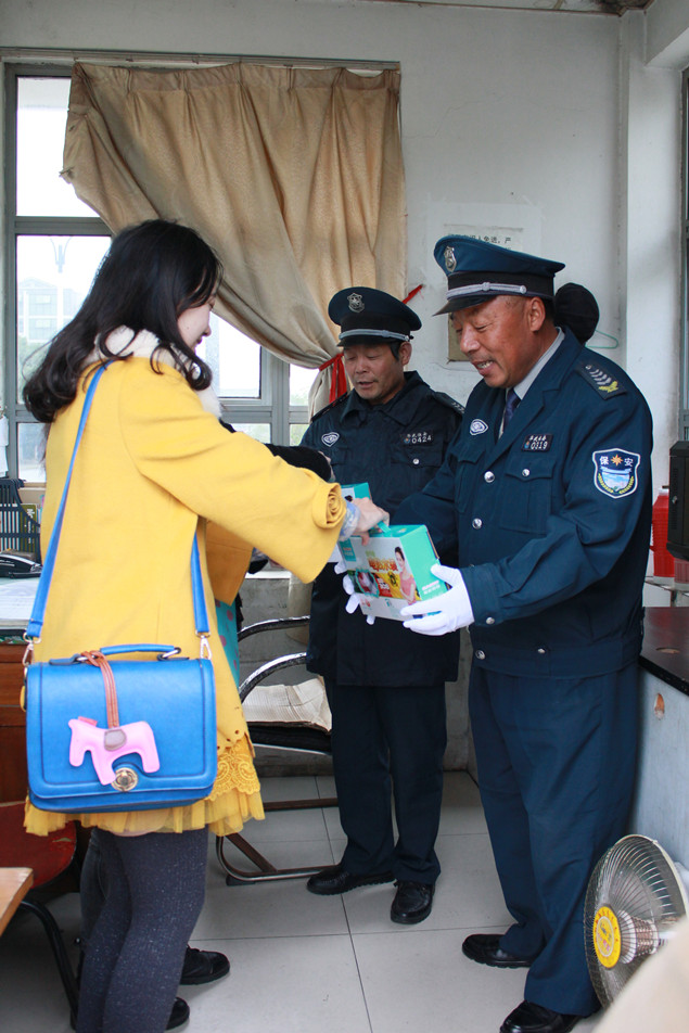在活动接近尾声的时候,徐雯和顾怡欢同学为大叔送上了精心准备的小礼物——暖手宝,以表示我们对门卫大叔辛勤工作的尊重和理解,以后我们也会呼吁更多人尊重与理解。”大叔们很感动,说谢谢我们的理解,心里暖暖的。门卫大叔为了感谢同学们,还特意拿出一袋橘子给大家吃,同学们心里也暖暖的。