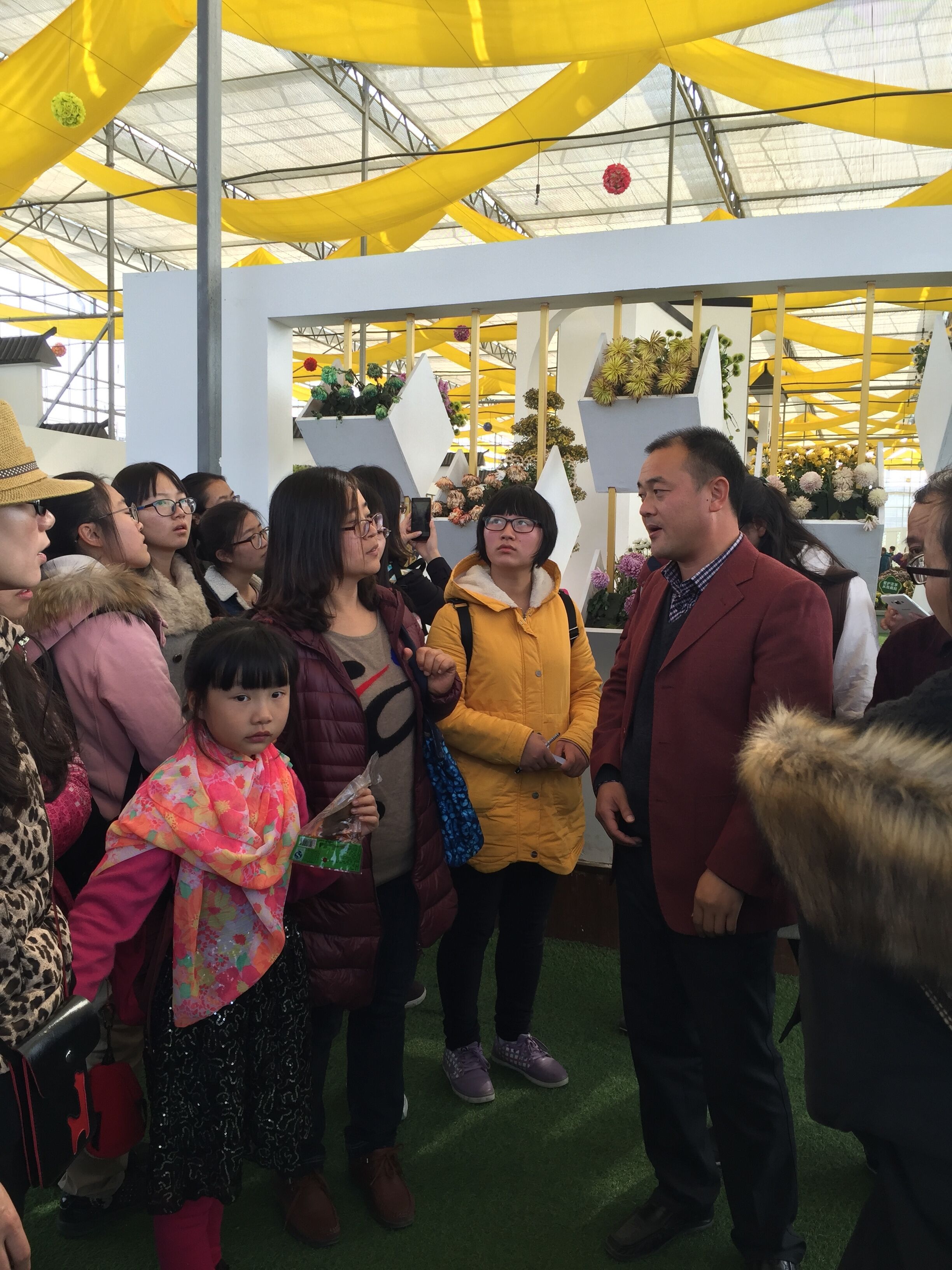 中国菊花种质资源保存中心是国内最大的菊花专业化研发和生产示范基地,具有4000平方米的玻璃温室、26000平方米的连栋薄膜温室和大面积的菊花田。这里有切花菊、盆栽菊、造型菊和功能性菊花几大类,品种丰富,花色、花型多样,不仅有各种传统秋菊,更有绿色大菊、草莓菊等少见品种,双色、绿色、间色等市场稀有品种菊花,在这里都可以找到,朵朵菊花形成壮观的花海,争奇斗艳。 菊花基地的老师为我们带领我们参观了整个菊花园,并详细的介绍了整个菊花园的情况。在菊花的主题展览馆内,以不同的主题呈现出一幅幅精美的菊花园美景。在生产园中,可见到多姿多彩的不同菊花品种。同学们积极认真的听老师的讲解,不断的在小本上记录着,更不忘拍张照片留下菊花的美丽。