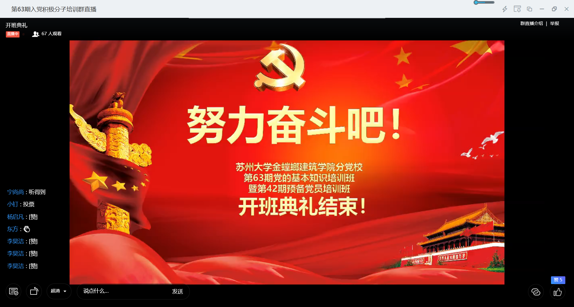 下午两点,典礼正式开始。全体起立、奏唱国歌。首先由分党校指导老师成龙做党校培训动员讲话。他提出希望大家能够遵守培训班对学员的要求,培训期间要认真学习理论知识,结合实际写好学习心得,努力提高思想素质和理论水平,在疫情防控期间上好网课,模范带头参加社会实践,在疫情后文明返校过程中,积极为同学服务,带动身边的同学共同进步。