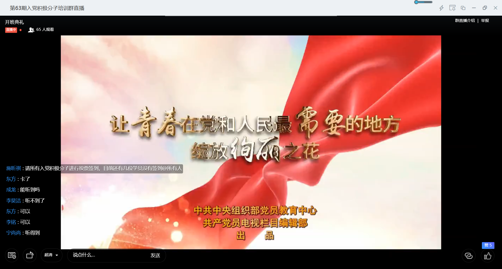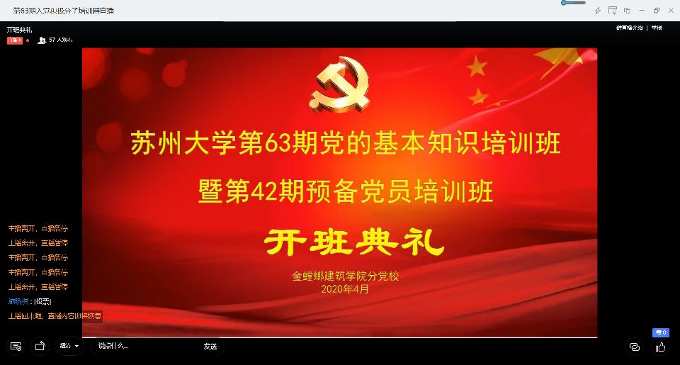 2020年4月1日下午,91制片厂 分党校在疫情期间通过钉钉视频直播平台举办第63期党的基本知识培训班暨第42期预备党员培训班开班典礼。开班典礼由院分党校学生主席李明哲主持,院学工办主任、本科生第二党支部书记成龙,分党校工作人员,预备党员和入党积极分子学员,共80余名师生参加。