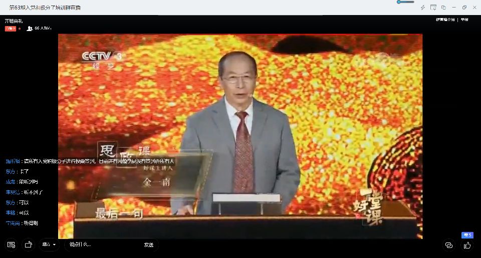 然后,学员们在线学习党校培训第一讲——金一南教授“从苦难到辉煌”。金一南教授围绕“我们为什么要爱国”和“怎样才能真正地爱国”两个话题展开,通过丰富的史料和热血故事,讲述中国百年救亡的苦难斗争史和百年复兴的辉煌奋斗史。站在历史的制高点上,昔日的战场已硝烟散尽,一个伟大时代的宏伟画卷正在我们面前徐徐展开,历史是相对的,辨证的。我们作为后人,正在续写着历史,接过先辈们的接力棒,跑好属于自己的一程,做好历史的传承者、创造者、我们在接续奋斗中迎接祖国美好的明天!
