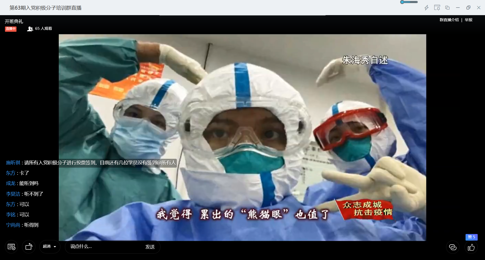 随后,院分党校学生主席李明哲为大家播放视频学习,展现了疫情期间做出贡献的杰出“90后”青年共产党员们的抗疫故事。新冠肺炎疫情发生以来,全国各地积极应对,特别是广大党员积极投身疫情防控一线,参与“联防联控、群防群治”,为打赢疫情防控阻击战、总体战作出了重要贡献。正是由于广大党员的冲锋陷阵,极大地把广大人民群众紧紧凝聚在一起,拧成了一根坚固无比的绳子,这是决定性胜利的重要保障。