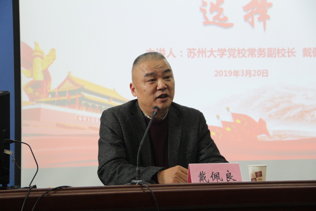 随后,91制片厂 党校常务副校长戴佩良做主旨演讲,主题是《选择》。戴校长首先指出,在座的各位选择加入中国共产党是正确的、明智的。因为经过百年时间见证与考验,中国共产党的确是伟大的、杰出的。中国共产党由当初一个只有十几人的政党发展成如今中华人民共和国的执政党,历经磨难,久经考验是历史的选择、人民的选择。随后戴校长从中国共产党的最初讲起,那时战火纷飞、时局动荡,党对党员的要求只要你有一颗爱国心,不怕牺牲就能成为一名党员;时过境迁,随着时代的发展,如今党对党员的选择要求已经发生了天翻地覆的变化,如果你仅仅是满足之前的条件已经不足以加入党了。戴校长指出,现在入党的门槛越来越高,考核流程越来越长,就是因为现在需要更加优秀、杰出的人加入中国共产党,为人民、为社会、为国家做出贡献。而我们既然选择加入中国共产党就必须要有这方面的思想觉悟。最后戴校长对学员提出三点要求:第一端正态度。态度决定一切,做任何事都要有一个认真的态度。其次注重传承中华的传统文化,尤其是孝道。百善孝为先,一个人如果不尊重父母、长辈、老师、以及处理好与同学之间的关系就不能成为一名党员。最后,戴校长强调作为一名中国人的民族气节,不能崇洋媚外,要尊重、爱护自己的祖国,做到爱国不能只是嘴上的口号,而要落到实处。