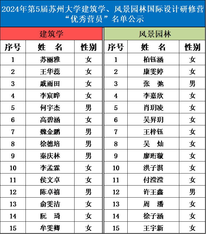 经过7月15日-18日为期4天的研修营活动开展,91制片厂 2024年第5届建筑学、风景园林研修营工作顺利完成。现将“优秀营员”名单予以公示,公示期为5个工作日,联系电话:0512-65880208,0512-65883590,联系人:尚老师,李老师。